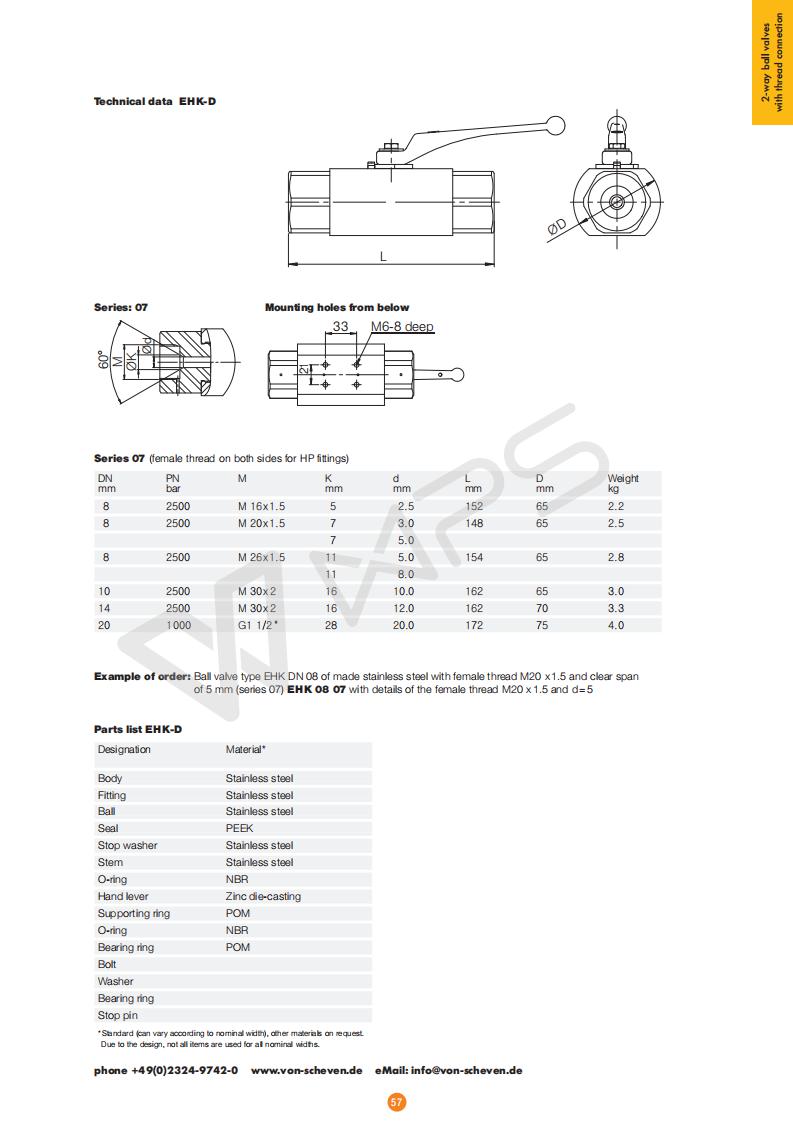 德國von scheven是歐洲著名的球閥制造商,是一家有80多年歷史的家族企業。德國von scheven的產品取得德國TUV認證、ISO9001認證、AD-2000認證、DGRL97/23/EG、TA-Luft認證、TEPD認證、GWI認證、VDS認證、DVGW認證、SVGW認證、俄羅斯EAC認證 技術說明:EHK-D型球閥由一個圓形外殼和兩側擰緊的連接件組成。主軸防吹出設計。殼體和擰入件設有安全孔。可以加裝執行器連接套件,訂購時必須指定這種改裝(額外收費)。 這種高標準的高壓技術在可靠性、易安裝性和易用性方面得到世界公認。 僅在減壓時啟動! 使用條件超出本數據表中列出的標準要求的,請另行咨詢; 必須始終遵守操作和維護說明,特別是安全說明; 有關操作和維護說明以及認證證書,請訪問江蘇卡特斯; 我們保留進行技術更改的權利。  |
