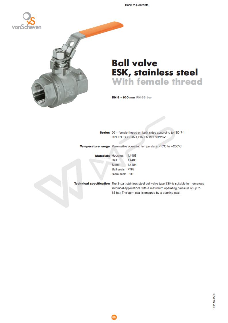 德國(guó)von scheven是歐洲著名的球閥制造商,是一家有80多年歷史的家族企業(yè)。德國(guó)von scheven的產(chǎn)品取得德國(guó)TUV認(rèn)證、ISO9001認(rèn)證、AD-2000認(rèn)證、DGRL97/23/EG、TA-Luft認(rèn)證、TEPD認(rèn)證、GWI認(rèn)證、VDS認(rèn)證、DVGW認(rèn)證、SVGW認(rèn)證、俄羅斯EAC認(rèn)證 技術(shù)說明: ESK型是兩片式不銹鋼球閥適用于多種類型技術(shù)應(yīng)用,最大操作壓力可達(dá)63bar。 閥桿密封由一個(gè)填料密封保證。 使用條件超出本數(shù)據(jù)表中列出的標(biāo)準(zhǔn)要求的,請(qǐng)另行咨詢; 必須始終遵守操作和維護(hù)說明,特別是安全說明; 有關(guān)操作和維護(hù)說明以及認(rèn)證證書,請(qǐng)?jiān)L問江蘇卡特斯; 我們保留進(jìn)行技術(shù)更改的權(quán)利。  |